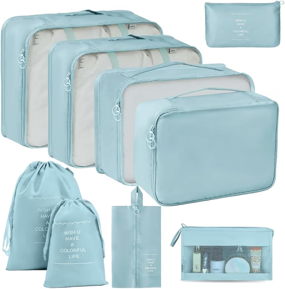 9-PIECE SET– embody 3 garments baggage(15.8*11.8*4.3in, 12.6*9.8*4.3in, 11.8*8.9*4.3in), 1 underwear bag(11.4*7.9*4.3in), 1 shoe bag(8.3*13.4*3.9in), 2 drawstring bag(10.2*14in,9.8*6.3in), 1 toiletry bag(10.24*5.9*3.5in), 1 equipment bag(10.24*6.3in). You possibly can retailer and shield your clothes, cosmetics, and different private merchandise, clear and orderly.
