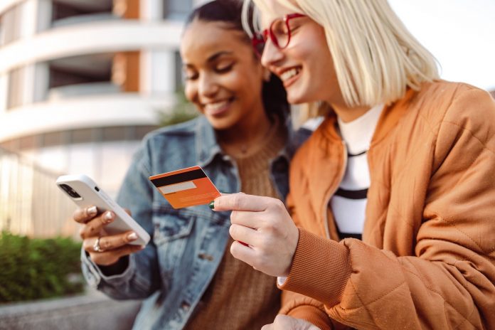 Two female friends using credit card and smart phone outdoors
