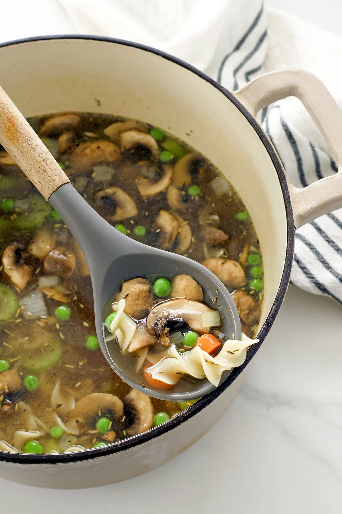 In the direction of the final 30 minute of prepare dinner time, prepare dinner the egg noodles in a separate pot of salted water in line with the instructions on the again of the bundle. Drain and add to the pot together with the peas, and mushrooms.