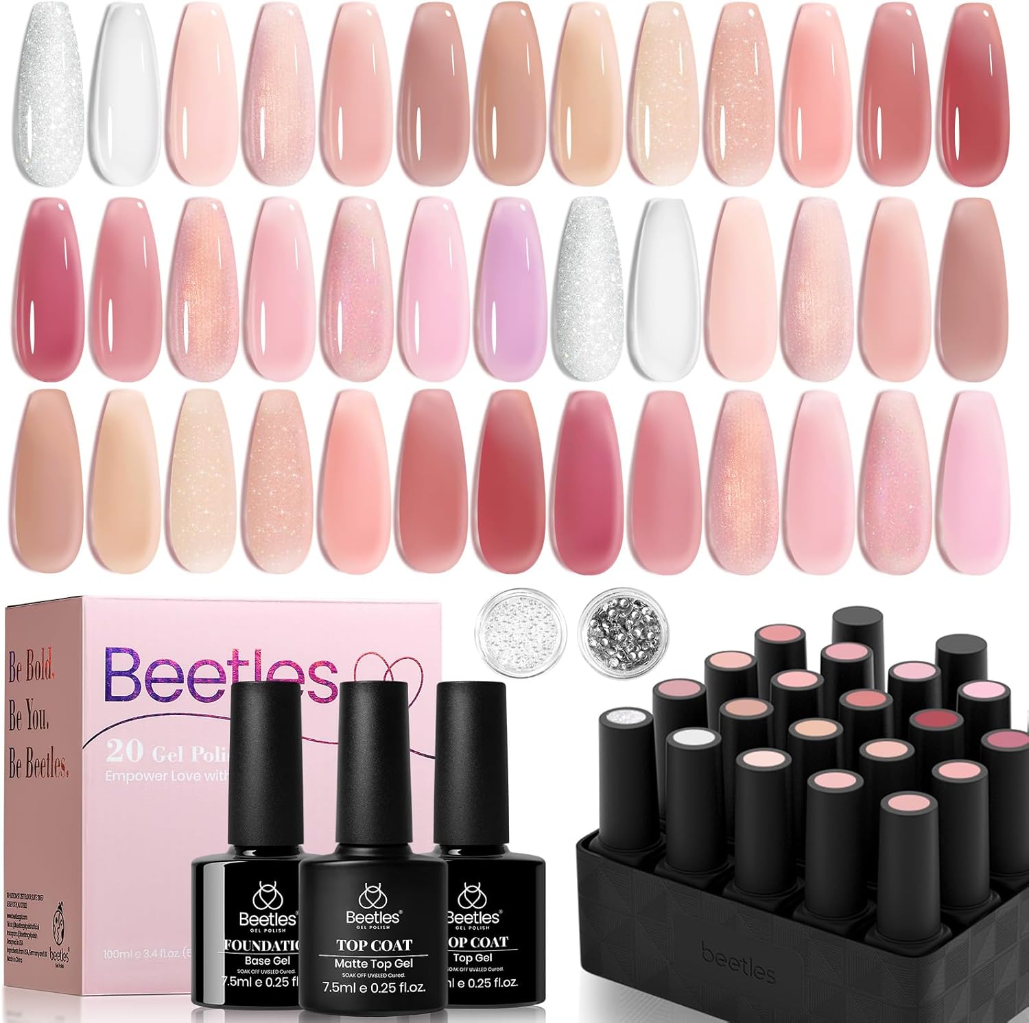 What you Get: 20 Colours of 5 ml beetles jelly gel nail polish, 7.5 ml gel base coat, 7.5 ml*2 no wipe shiny and matte gel high coat, and nail artwork charms (Rhinestones and Pearls) *2. Nude gel nail polish gel is a semitransparent nail gel.