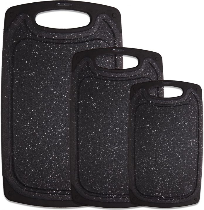 BETA SPACE Chopping Board, Set of three Kitchen Plastic Chopping Boards Non-Slip with Grip Deal with Juice Grooves for Meat Greens Fruits. Black