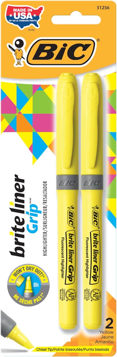 BIC Brite Liner Grip Highlighters are a fantastic addition to varsity provides that includes vivid inks to make organizing or adorning your notes straightforward and enjoyable. These highlighters match comfortably in your hand with a delicate grip for added consolation and management. Every dependable highlighter writes for as much as eight hours and not using a cap and never dry out. The versatile chisel tip, which supplies seamless transitions from high quality underlining to broad protection, ensures ease of use and eliminates the necessity for a number of highlighters.