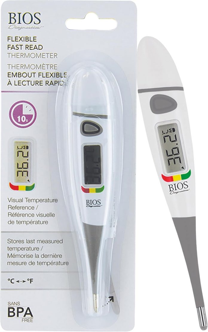 Visible temperature reference confirms the studying is regular (inexperienced), elevated (yellow) or fever (crimson)