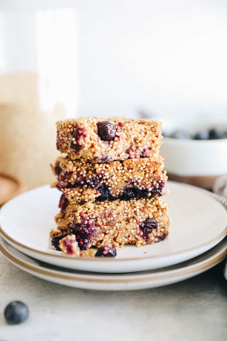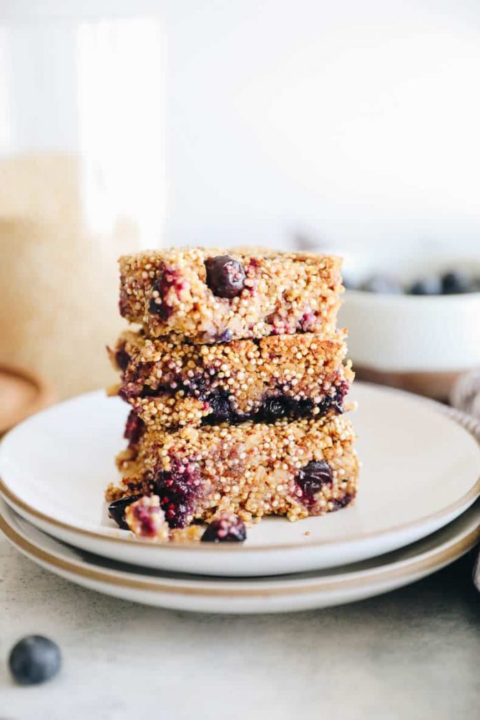 blueberry quinoa bars stacked in three on a white plate.blueberry quinoa bars stacked in three on a white plate.