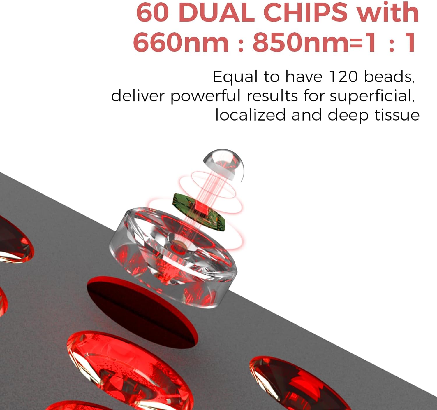 60 Twin Chips Grade LED Gentle: The crimson mild remedy for full physique combines with 60 grade twin chip led mild, equals to have 120 beads on this crimson mild panel. The 660nm and 850nm beads present highly effective mild remedy outcomes. Give 15-Half-hour to get a crimson mild lamp remedy at dwelling,workplace, gymnasium and anyplace