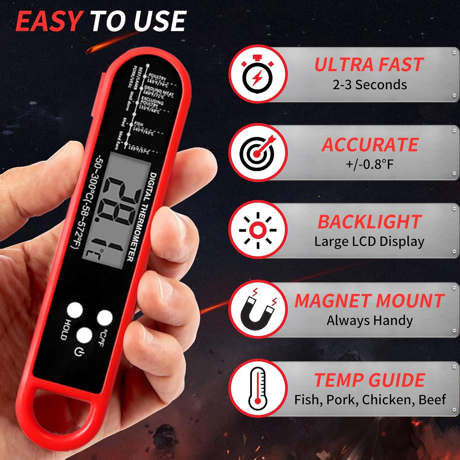 Quick and Exact Efficiency: That includes a 4-inch food-grade stainless-steel probe and a high-precision sensor, this meat thermometer supplies temperature readings inside 3-4 seconds with an accuracy of ±0.9°F. It covers a variety of -58°F to 572°F (-50°C to 300°C), preferrred for all of your cooking wants.