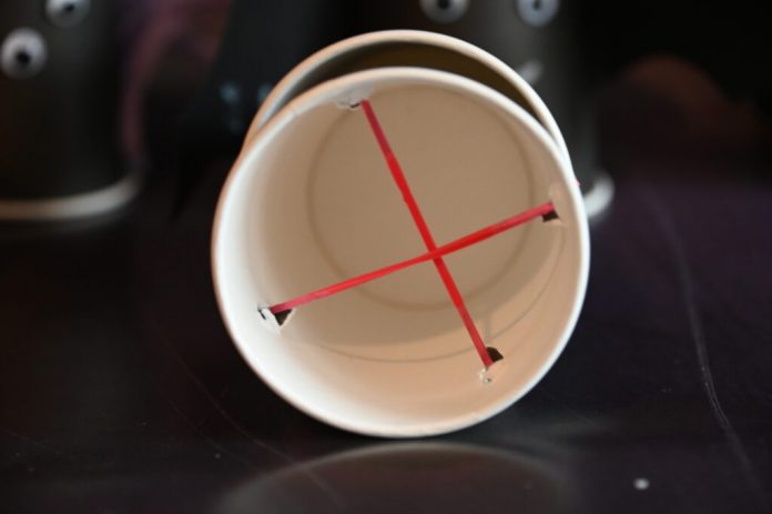 Thread the elastic bands via the holes within the cup as proven and safe the ends with tape. That is the mechanism that may catapult the paper cup bats into the air. Put this cup inside one other cup (that is simply so it seems higher and isn’t obligatory).