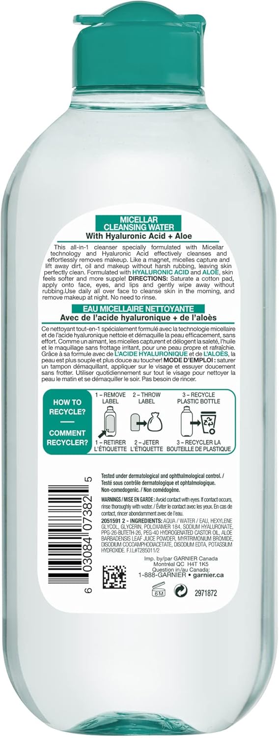 Field incorporates: Garnier Micellar Cleaning Water, With Hyaluronic Acid and Aloe, Cleanses and Removes Make-up, Pores and skin Seems Replumped, No Rinsing, Quantity: 400ml