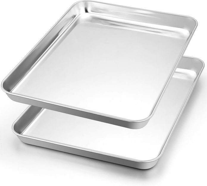 EASY TO USE: This stainless-steel baking trays can stand up to excessive temperatures as much as 450°F, One-piece construction ensures even heating and higher cooking efficiency, Acceptable weight of 715g make you are feeling excellent in arms, Very sturdy for years to return