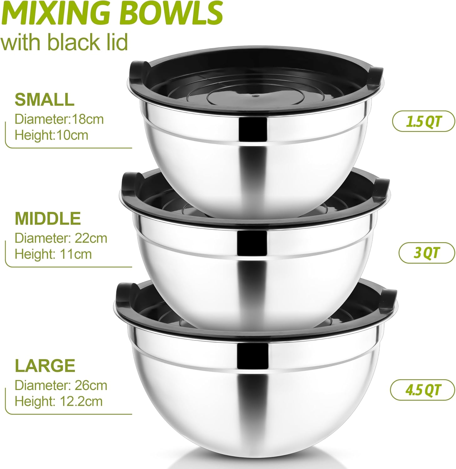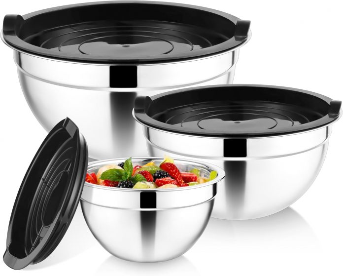[3 STACKABLE SIZES] – Our mixing bowl set has 3 completely different capacities, specifically 4.5/3/1.5 quarts, providing you larger flexibility when in use, additionally may be properly nested one upon one other to avoid wasting house, preserve organized and tidy, Basic black covers go properly with kitchen of assorted ornament kinds