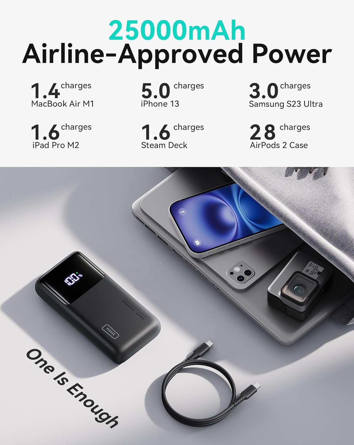 [Air Travel Ready: 25,000mAh Capacity] Keep powered up throughout your travels with a considerable 25,000mAh battery capability. It affords a number of gadget costs and is airplane-friendly for on-the-go energy, making lengthy flights and layovers a breeze.