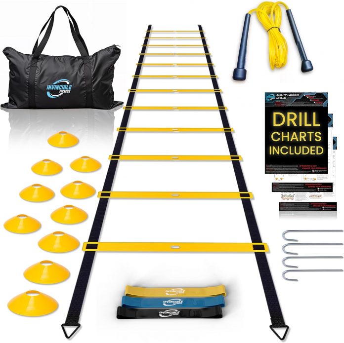 Full Coaching Equipment: Consists of agility ladder, 10 cones, 3 resistance bands, soar rope, steel stakes, and a carry bag – every thing for a full-body exercise, best for all health ranges and ages.