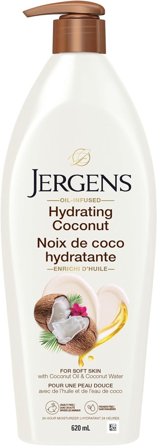 Quench your dry pores and skin with Jergens Hydrating Coconut Moisturizer. This nourishing oil mix formulation is infused with coconut oil and coconut water, recognized for his or her revitalizing properties. The formulation drenches your pores and skin in moisture to supply unbelievable softness and offer you radiant, glowing, visibly stunning pores and skin. Oil-infused formulation from Jergens Skincare lock in 24-hour hydration utilizing the moisturizing energy of important components. Nourish the pores and skin day by day with this quick-absorbing physique lotion with no greasy or heavy after-feel. Ultimate for regular to dry pores and skin; 620 mL dimension; dermatologist, dye-free, and cruelty-free.