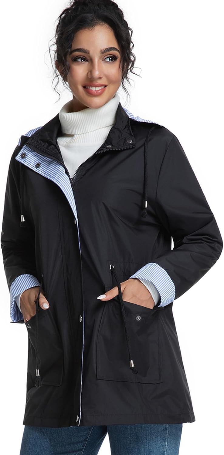 Womens Raincoat Windbreaker Waterproof Light-weight Lined Hooded Rain Jacket