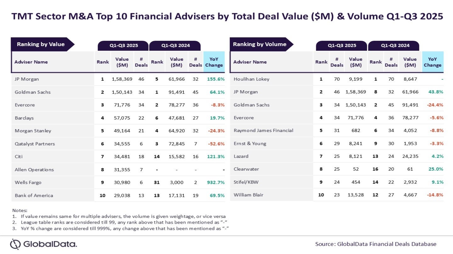JP Morgan has ranked first by deal worth and Houlihan Lokey by deal quantity amongst monetary advisers for mergers and acquisitions (M&A) within the expertise, media and telecom (TMT) sector in the course of the first three quarters of 2025, in response to analysis from GlobalData.