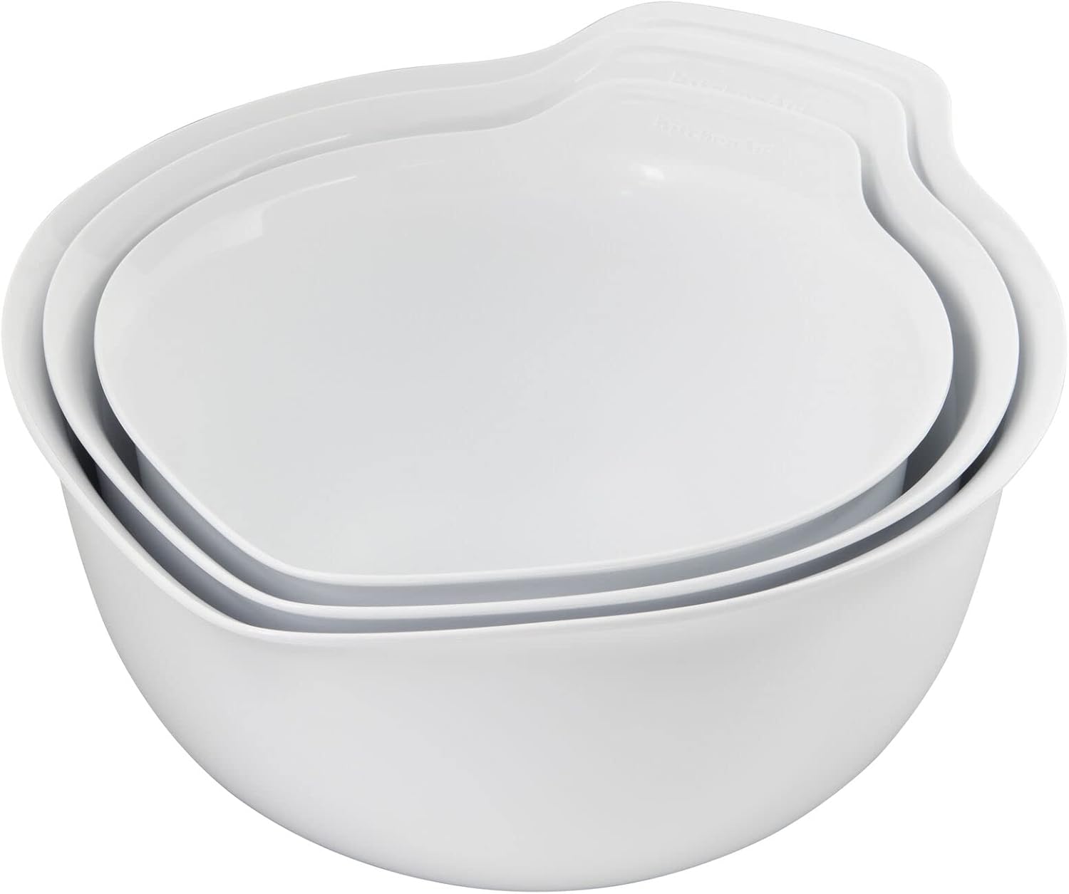 These KitchenAid mixing bowls are a kitchen important. They every function a non-slip base and easy-pour spouts to cut back the possibility of spills and mess. This set contains three sizes: 2.5 quart, 3.5 quart, and 4.5 quart. The bowls nest collectively when not in use for straightforward storage. Dishwasher protected. Lifetime restricted guarantee.