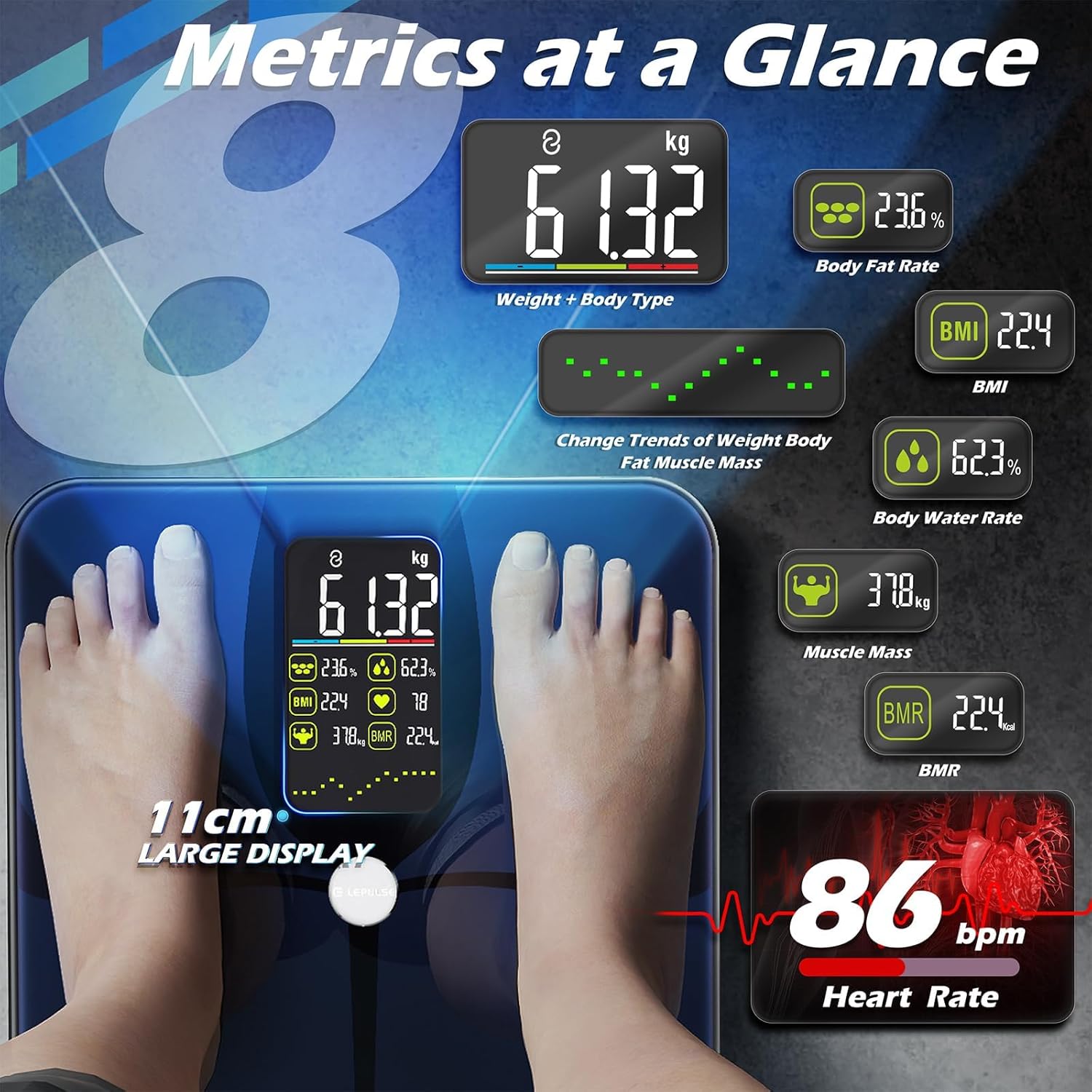 EXTRA LARGE DISPLAY OFFLINE: Completely different from different weight scales for those that solely shows weight, Our sensible scale & physique analyzer built-in algorithm can use offine and present 8 important metrics on the big display screen straight. Physique Weight scale with Physique Fats, BMI, Muscle Mass, Water, Coronary heart Charge, Bone Mass and Physique Kind, assist you to get a transparent view of your 8 important physique measurements at a look with out cellphone. (Hook up with app when utilizing for the primary time.)