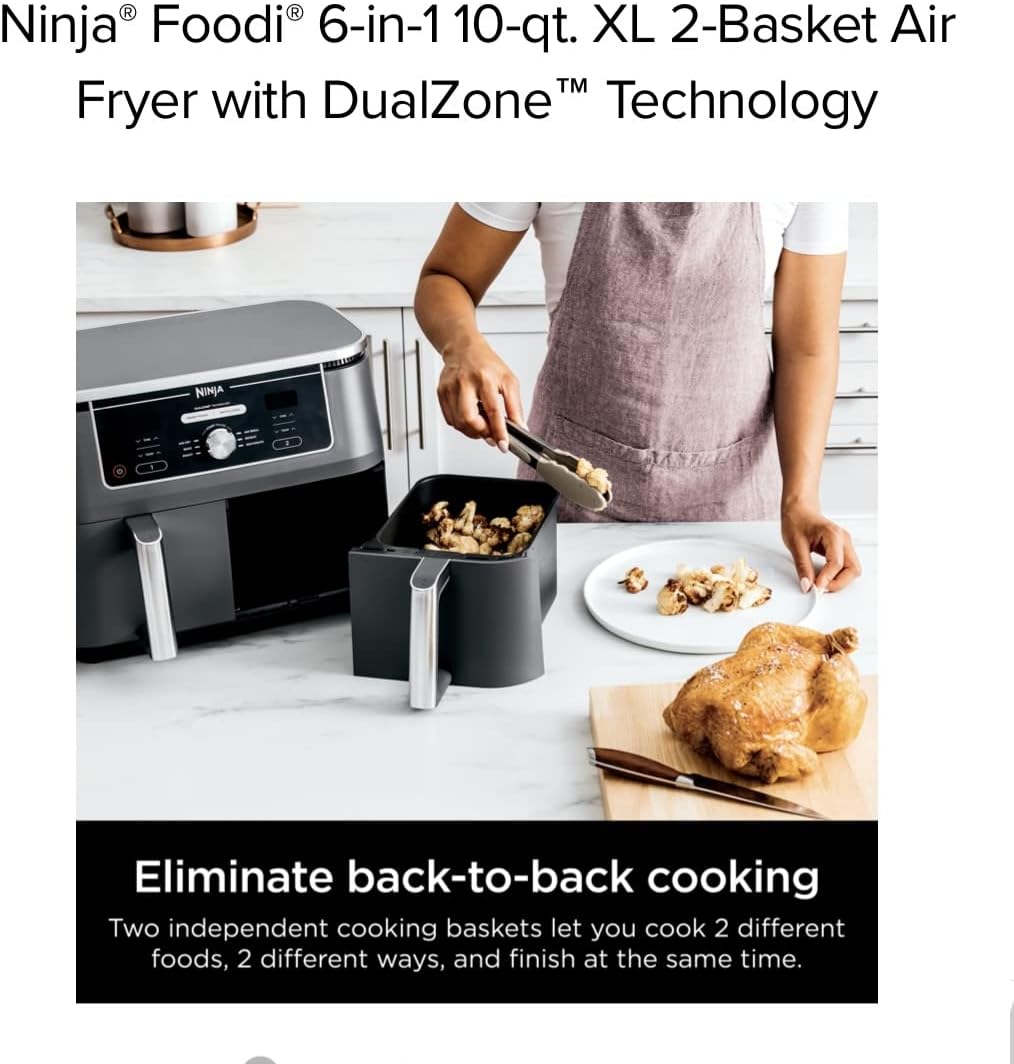 Meet the Ninja Foodi 6-in-1 10-qt. XL 2-Basket Air Fryer with DualZone Expertise and IQ Increase. This XL 10-qt. the air fryer has 2 impartial baskets that allow you to cook dinner 2 meals directly, no back-to-back cooking like a conventional single-basket air fryer. The XL air fryer with 2 impartial baskets that allows you to cook dinner 2 meals, 2 methods, on the similar time, not back-to-back like a conventional single-basket air fryer. DualZone Expertise contains the Sensible End characteristic for cooking 2 meals 2 ways in which end on the similar time, and the Match Prepare dinner characteristic, which simply copies settings throughout zones for full 10-qt. capability. – IQ Increase optimally distributes energy throughout every basket to cook dinner a 6-lb. entire rooster and aspect as shortly as attainable when Match Prepare dinner or Sensible End is just not chosen. – 6 versatile cooking applications: Air Fry, Maintain Heat, Roast, Bake, Reheat and Dehydrate. – XL 10-qt. capability and a couple of baskets, you possibly can whip up a important and a aspect on the similar time for fast massive household meals, or as much as 8 lbs. of rooster wings. – 2 impartial 5-qt. zones have their very own cooking baskets, cyclonic followers, and speedy heaters. – Simple-to-clean baskets and dishwasher-safe crisper plates. – Vast temperature vary: 105°F–400°F. – As much as 75% much less fats than conventional air frying strategies. *Examined in opposition to hand-cut, deep-fried French fries – Cooks two 6-lb. chickens as much as 30% sooner than a conventional oven.