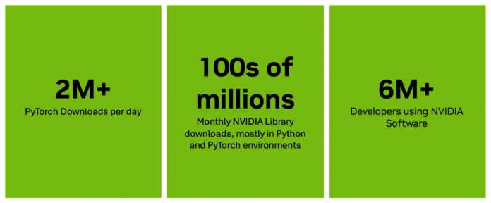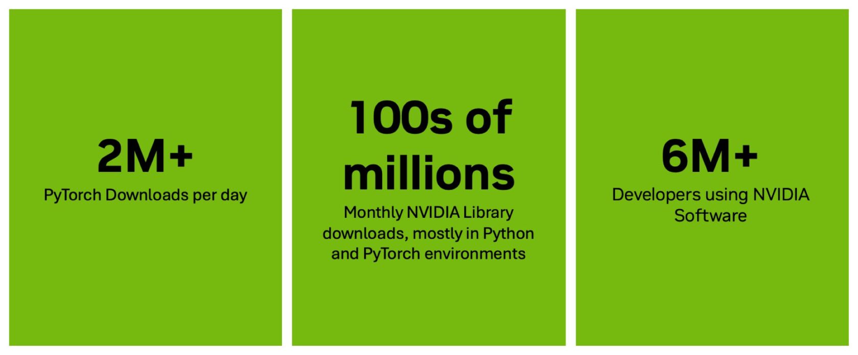 Infographic that says: 2 million+ PyTorch downloads per day; hundreds of millions of monthly NVIDIA SDK usage, mostly in Python and PyTorch environments; and 6 million+ developers using NVIDIA software.