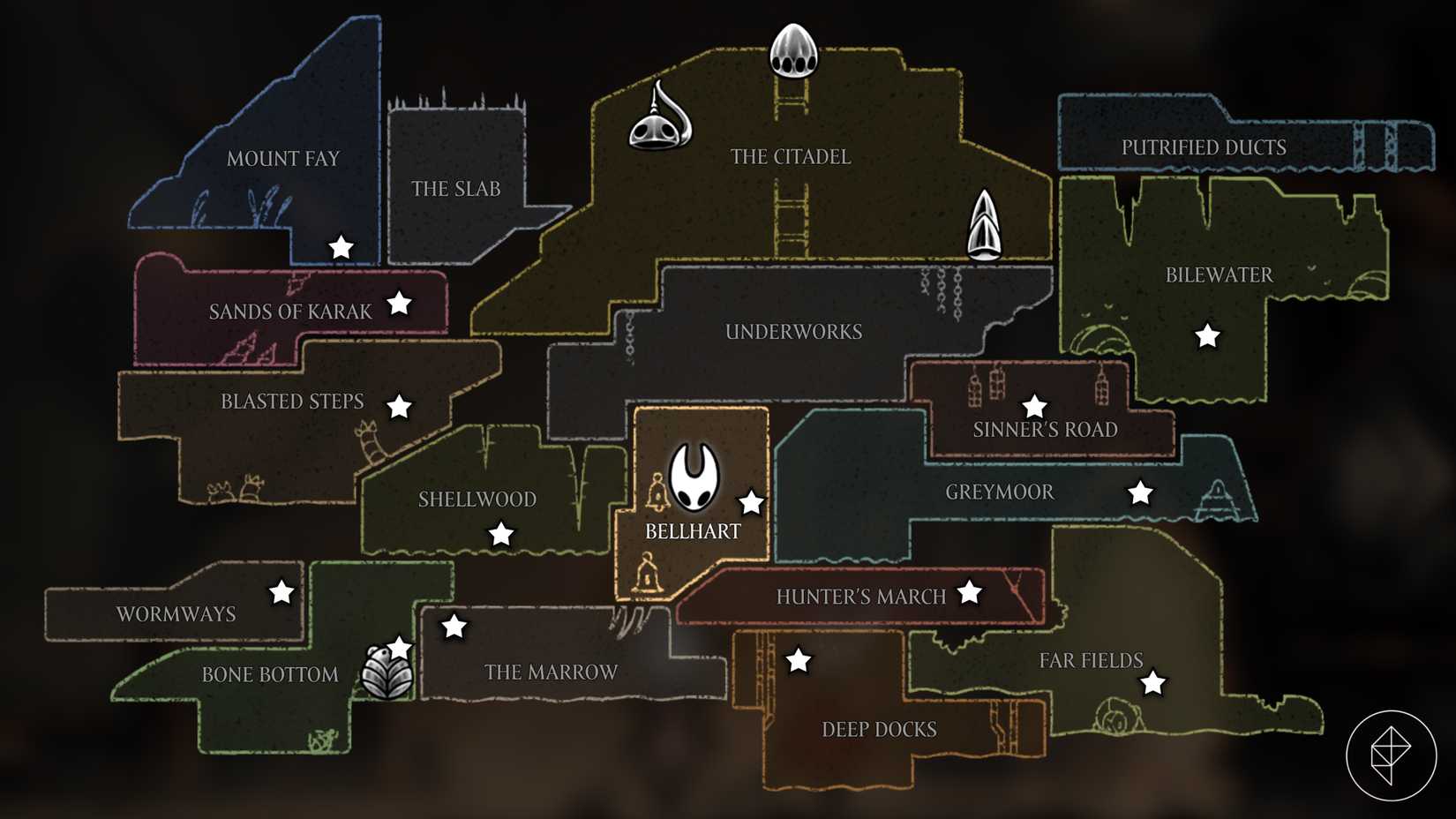 All of Shakra's locations before starting Trail's End in Hollow Knight: Silksong. Graphic: Marloes Valentina Stella/Polygon | Supply photos: Crew Cherry through Polygon