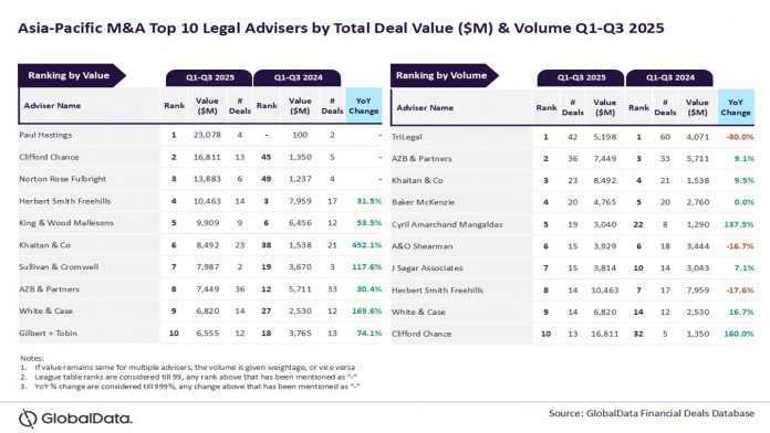 Paul Hastings and TriLegal have emerged because the main mergers and acquisitions (M&A) authorized advisers within the Asia-Pacific area for the primary three quarters (Q1-Q3) of 2025, in response to the most recent authorized advisers league desk launched by information and analytics agency GlobalData.