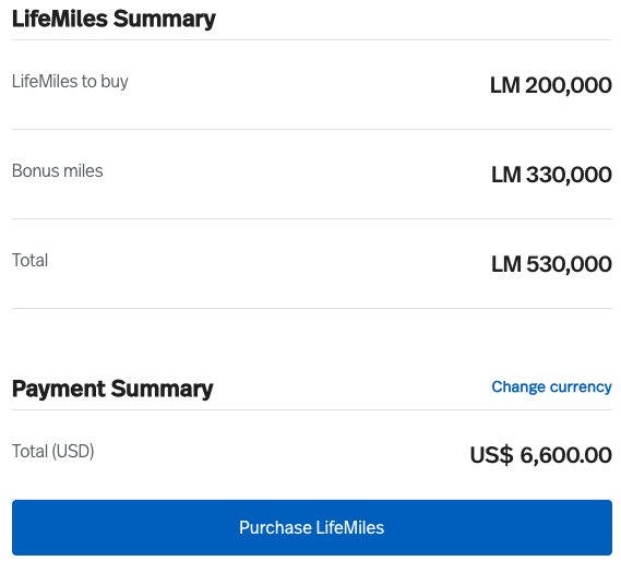As per the phrases and circumstances, LifeMiles should be bought in increments of 1,000, and the minimal buy quantity is 1,000 miles.