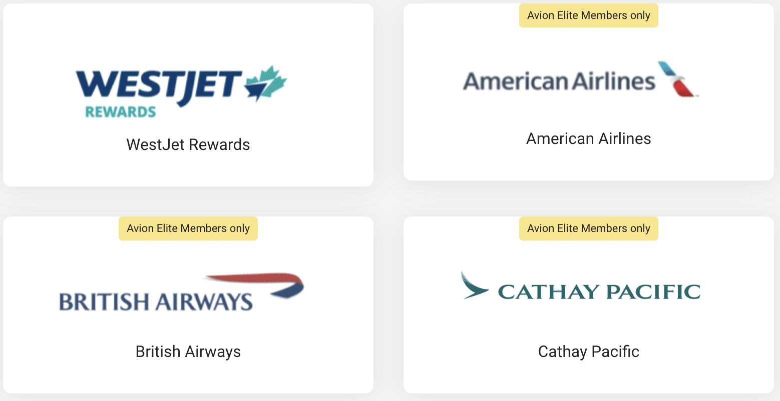 Premium members can’t switch Avion factors to a few of the 4 airline companions accessible via the Avion Rewards program. The exception is WestJet Rewards, to which Avion factors will be transferred at a price of 1:1 (100 Avion factors = 100 WestJet factors).