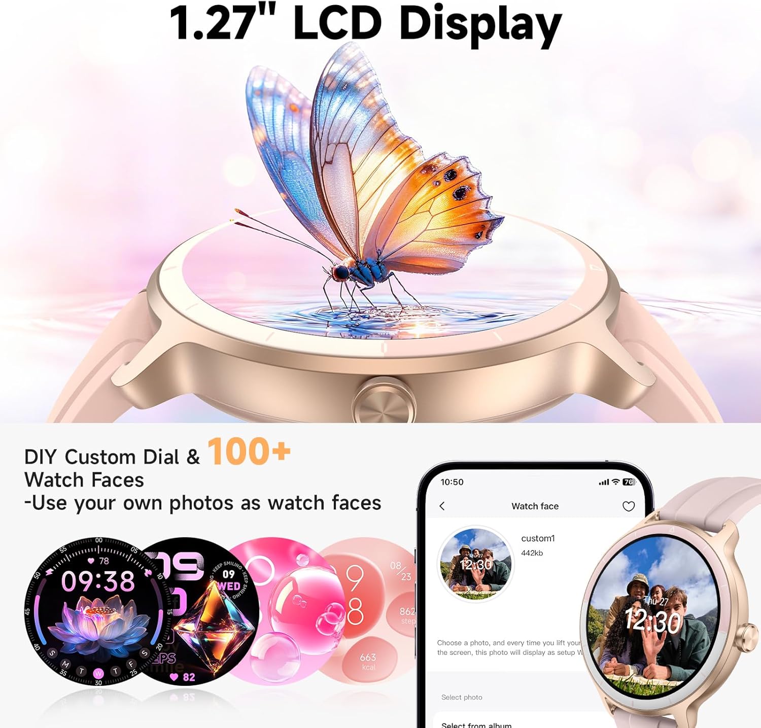 1.27-Inch HD Show & Customizable Watch Faces: The good look ahead to iphone android take pleasure in a 1.27-inch full-touch HD display that provides a crisp, clear show and easy contact interplay for easy use. Personalize your watch with 100+ built-in watch faces or add your personal pictures to create a singular design. Match your watch face to your fashion, temper, or event with customization choices.