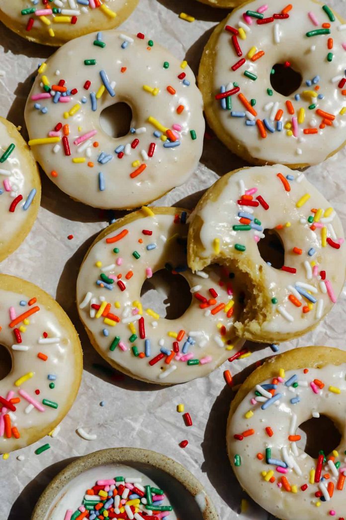 - Cinnamon sugar topping: Love cinnamon sugar donuts? Use ⅓ cup granulated sugar + 1 tablespoon floor cinnamon as a substitute of the glaze and sprinkles.