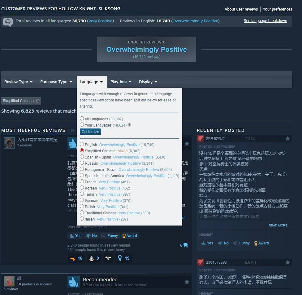 As you’ll be able to simply see due to Steam’s current introduction of language-specific overview splits, the combined critiques are distinctive to the 6,382 individuals who’ve left verdicts in Simplified Chinese language to this point. For each different language, together with Conventional Chinese language, the impressions being left are both largely or overwhelmingly constructive, although it is value noting {that a} sizeable quantity are extra reveals of help for Staff Cherry than correct critiques, being primarily based on lower than an hour’s playtime.