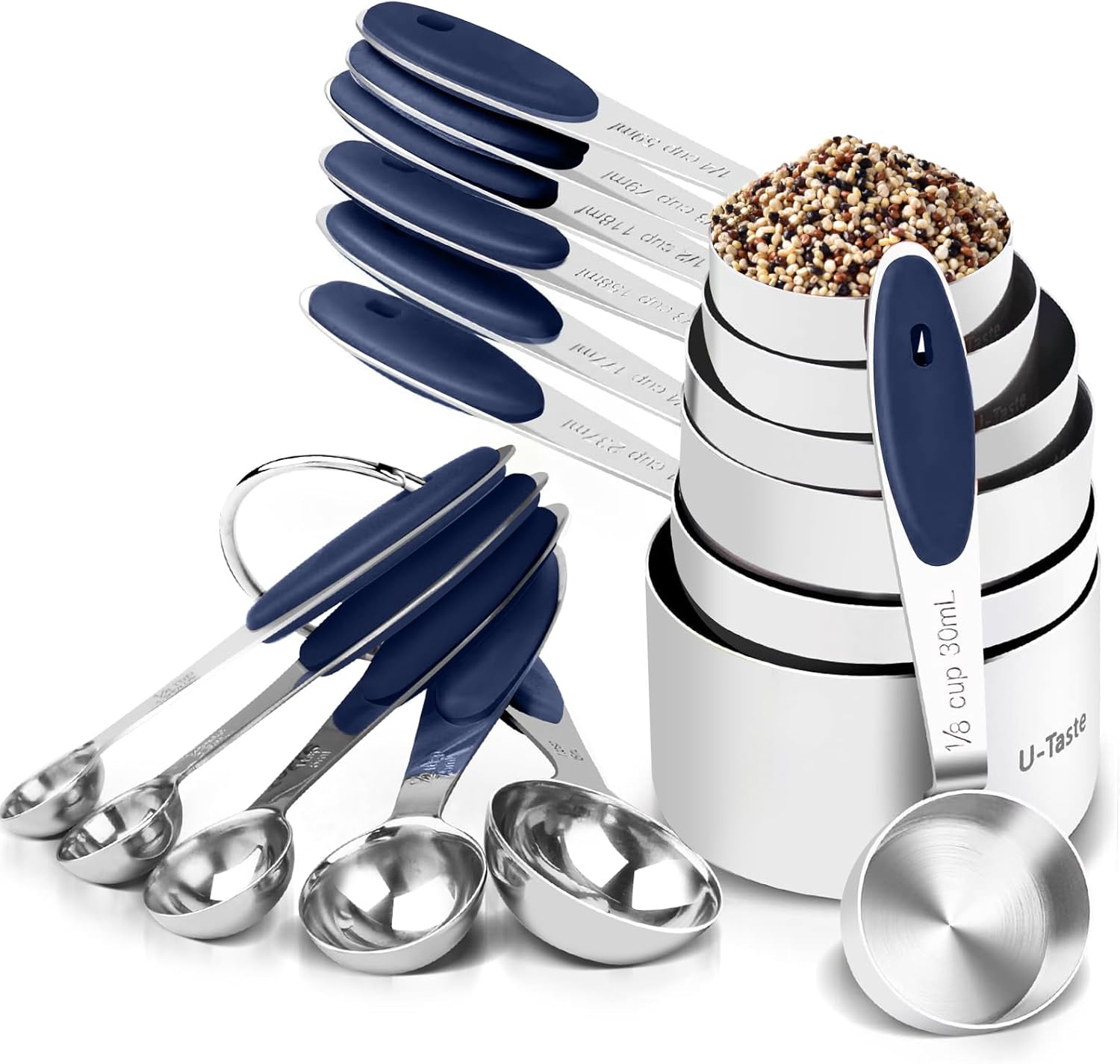 [Engraved measurements won’t wear away with use] Eliminate your painted measure set as a result of the paints will come off simply. Get U-Style set. Every cup has clearly engraved markings to indicate its “ml” and “cup” measurement and every spoon reveals its “ml” and “tsp”/”tbsp”. You needn’t wrestle making an attempt to learn when you’re measuring issues out. This measuring set consists of 1/8 cup, 1/4 cup, 1/3 cup, 1/2 cup, 3/4 cup, 2/3 cup, 1 cup & 1/4 tsp, 1/2 tsp, 1 tsp, 1/2 tbsp, 1 tbsp for various recipes.