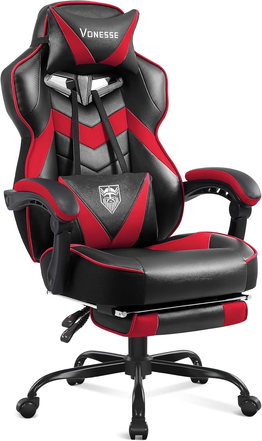Vonesse Gaming Chair, Reclining Gaming Chairs with Footrest and Therapeutic massage, Excessive Again Gaming Chairs for Adults with Pocket Spring Cushion, Large and Tall Pc Chair with Lumbar Assist (Crimson/Black)