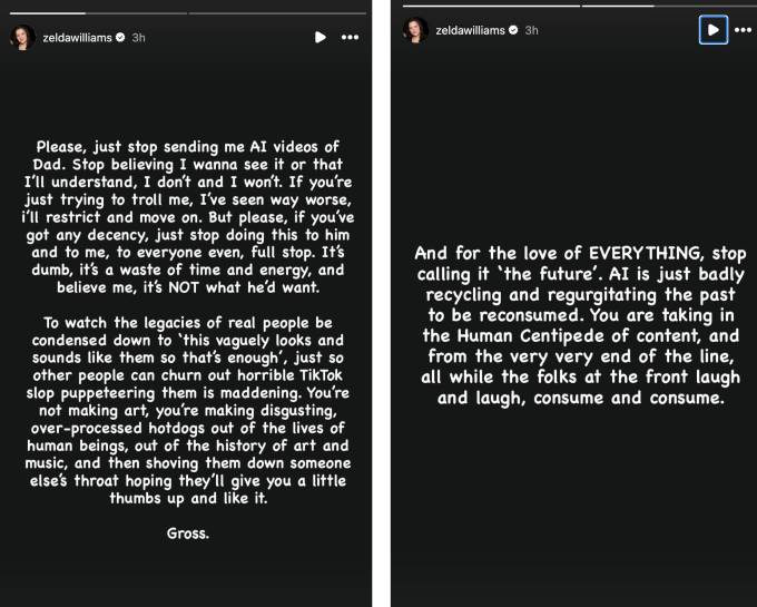 “Please, simply cease sending me AI movies of Dad. Cease believing I wanna see it or that I’ll perceive. I don’t and I received’t,” she wrote in a submit on her Instagram story on Monday. “In case you’ve obtained any decency, simply cease doing this to him and to me, to everybody even, full cease. It’s dumb, it’s a waste of time and vitality, and imagine me, it’s NOT what he’d need.”